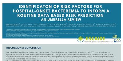 Background : Hospital-onset bacteremia (HOB) places an enormous burden on affected patients, healthcare workers and society. It is important to identify patient groups – and ideally individual patients – with the highest risk of HOB in order to intensify infection prevention/control measures. The overarching goal of the national BMBF-funded project RISK PRINCIPE (RISK Prediction for Risk-stratified INfection Control and PrEvention, Grant number: 01ZZ2323A) is to develop and implement a data-driven, risk stratified infection control system to effectively and efficiently reduce HOBs. To understand infection-related risks, the aim of the umbrella review was to identify, classify, and potentially weigh already known risk factors for the onset of HOBs and support algorithm development.